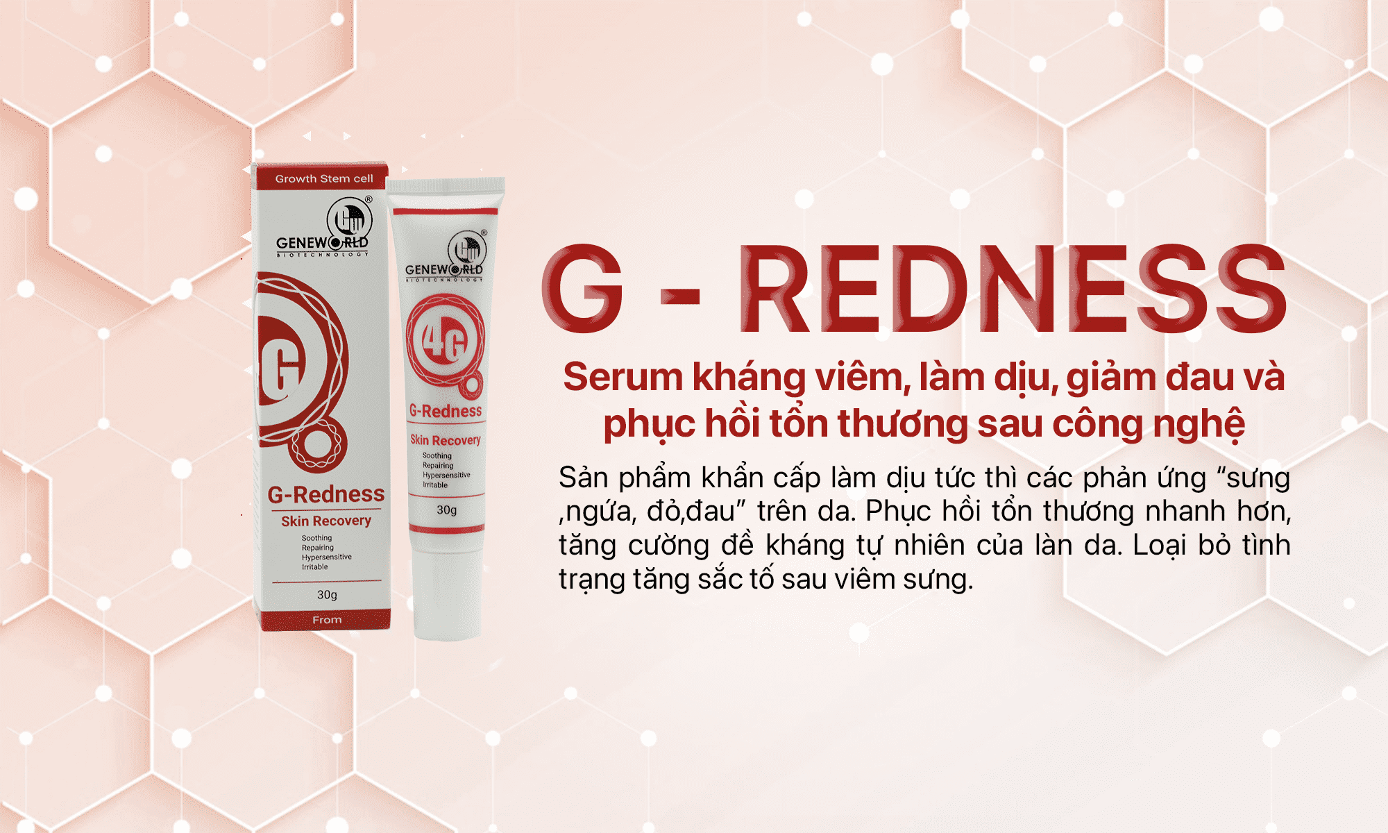 Làn da sau quá trình xâm lấn xuất hiện tình trạng tổn thương, ửng đỏ, dễ kích ứng. Sản phẩm G – REDNESS của Geneworld ứng dụng công nghệ tế bào gốc từ tảo xoắn Spirulina có tác dụng:
